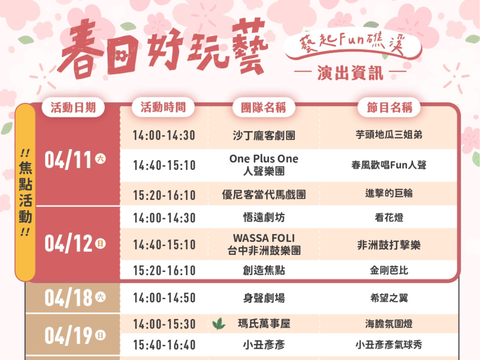 活動時間:115年4月11日至5月10日每週末。(詳參演出活動時間表)